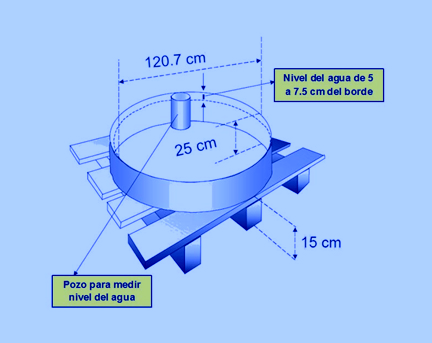 1. "Bandeja de Evaporación": El método más simple para estimar el valor de la Etp en un predio o zona es midiendo la Evaporación (E) mediante una bandeja de evaporación (“evaporation pan”). Este es el instrumento tradicional tipo “A” utilizado por décadas por el Servicio Metereológico Nacional (NWS) y otras entidades llevando a cabo estudios de clima (universidades, agencias de gobierno, consultores). El método consiste de instalar una bandeja circular con un diámetro de 120.7 centímetros (cm) y una profundidad máxima de 25 cm en un punto de interés, acompañada de un medidor de lluvia al lado de la bandeja de evaporación. La bandeja debe instalarse elevada sobre el terreno como ilustra la figura a la derecha inferior.