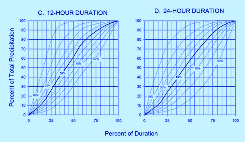 La lluvia en Puerto Rico varía a través de la Isla, aumentando de los valles costaneros hacia las laderas de las cordilleras y las montañas. Los bosque húmedos del Yunque, Carite, y Toro Negro experimentan lluvias torrenciales la mayor parte del año, con totales que pueden alcanzar hasta 240 pulgadas. La lluvia también varía a través del año dependiendo de los vientos, la temperatura y la humedad relativa en la atmósfera. Estas variaciones temporales y espaciales de la lluvia también se analizaron por el NWS como parte de la publicación del Atlas 14 del 2006. El Apéndice 1 del Atlas presenta datos de la distribución de lluvias de magnitud variable relacionadas a su acumulación en tiempo y magnitud. Curvas de la distribución temporal de lluvias representadas por acumulaciones de 12 y 24 horas se ilustran en las figuras siguientes. El Atlas 14 presenta curvas similares para acumulaciones de 1, 6, 12, 24 y 96 horas, valores de tiempo representativos de los eventos extremos con mayor probabilidad de ocurrir. Estas curvas se utilizan en los estudios para estimar escorrentías en el diseño de lagunas de detención y estructuras donde es necesario controlar las descargas a cuerpos de agua para cumplir con las reglamentaciones de la Junta de Planificación, la JCA y el Cuerpo de Ingenieros.