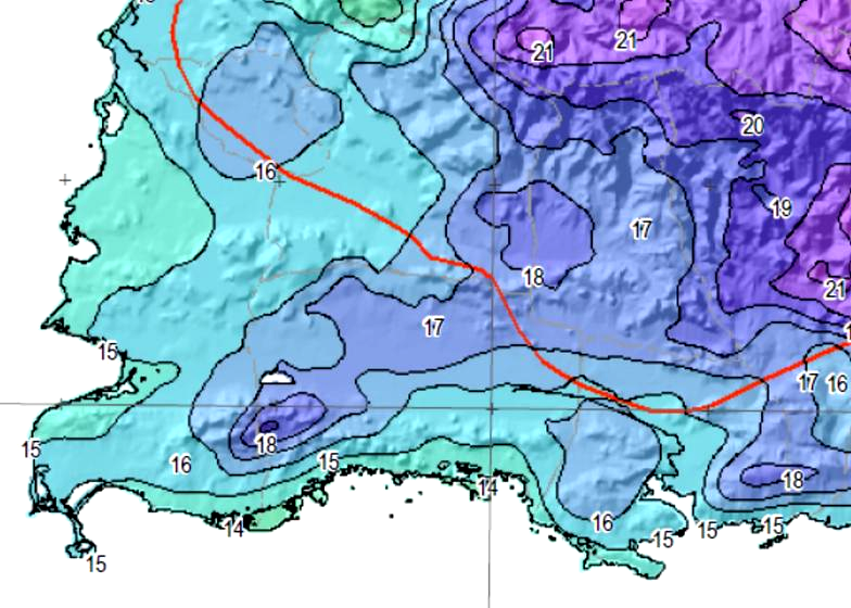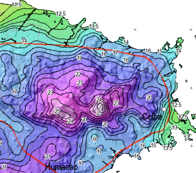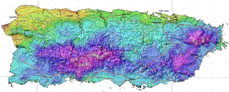 Además del Atlas 14 impreso, el NWS opera al presente una sub-página donde los usuarios pueden obtener los estimados de las frecuencias de lluvias para lugares específicos en Puerto Rico generadas en el análisis. Se provee un mapa interactivo de Puerto Rico, donde el usuario selecciona el lugar en la Isla donde le interesa determinar la frecuencia para cierta intesidad de lluvia. Al pulsar el lugar seleccionado en el mapa, se genera una tabla de las frecuencias e intensidades de lluvia para el lugar en particular. El link a esta sub-página es http://hdsc.nws.noaa.gov/hdsc/pfds/index.html, que puede accesar pulsando el link Atlas 14 NWS arriba. El mapa abajo es un ejemplo de las distribuciones de probabilidades de lluvia para todo Puerto Rico, en este caso la frecuencia representada por la lluvia para 24 horas con una frecuencia de 100 años. La escala de esta página no permite ver los detalles de las frecuencias, pero al bajar el mapa de interés de la página del NWS (en formato PDF), puede ampliar la imágen para ver las frecuencias como se ilustra en el zoom bajo el mapa. Además, la página del NWS le provee una tabla para el lugar específico de interés. Pulse el siguiente link para ir a la Página 2 de este tema.