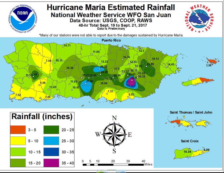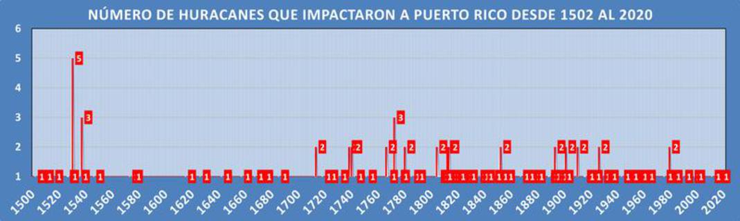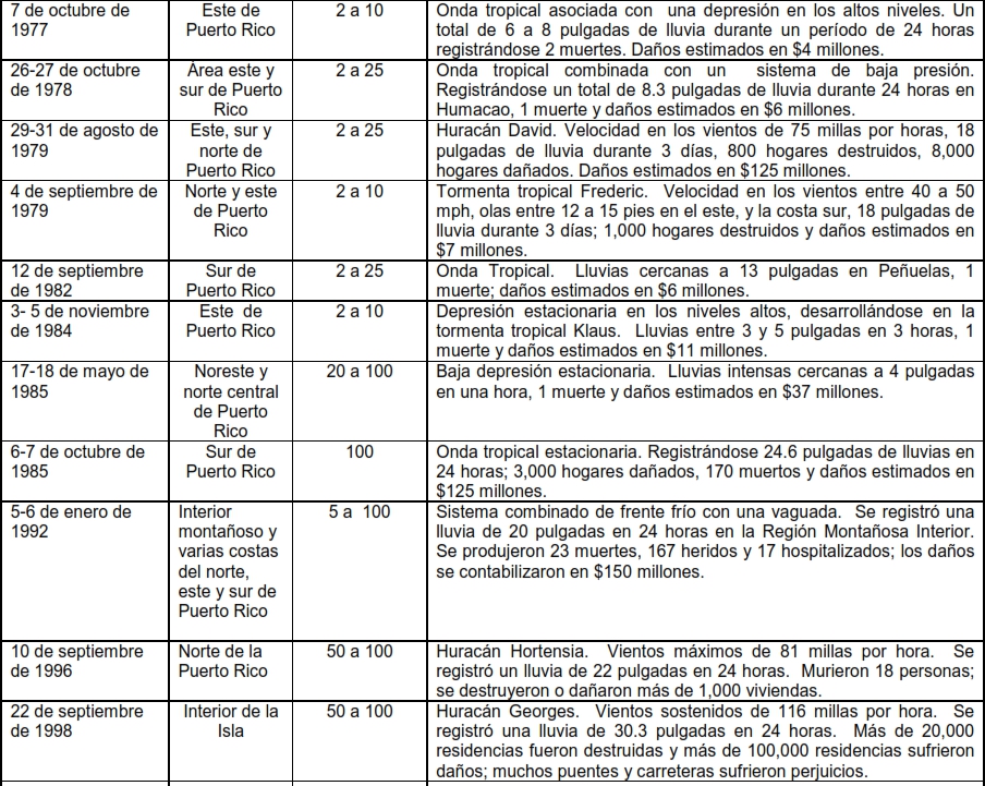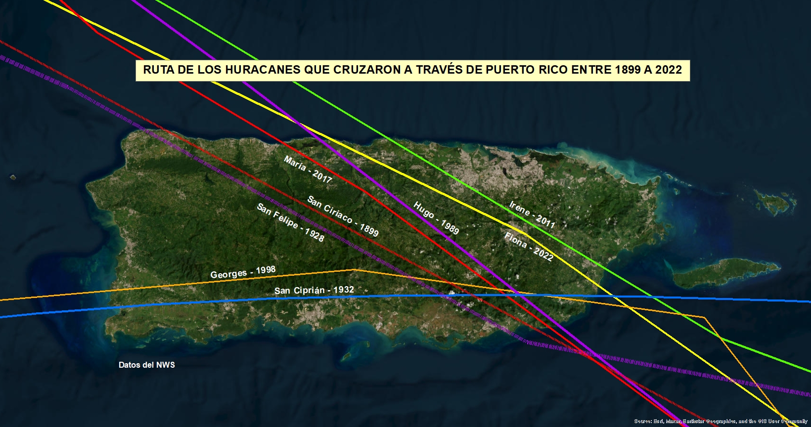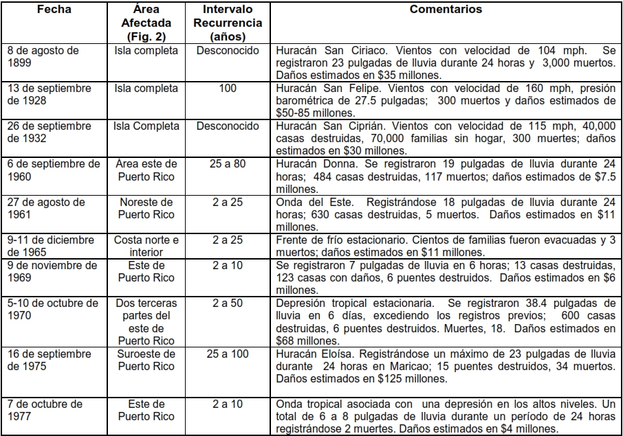 Puerto Rico se encuentra en la ruta de los huracanes tropicales en el Caribe, sufriendo en promedio los efectos directos e indirectos de un disturbio tropical cada diez años. Datos históricos establecen que desde 1502 hasta el 1989, un total de 108 huracanes o tormentas tropicales afectaron directa o indirectamente a Puerto Rico (Quiñones, 1992). Entre 1989 y el 2022, la Isla fue afectada por los siguientes huracanes o tormentas tropicales: Hugo (1989); Hortense (1996); Georges (1998); la tormenta tropical Jeanne (2004); Irene (2011); María (2017); y Fiona (2022). El huracán más destructivo de la historia de Puerto Rico probablemente fue San Ciriaco, que azotó a la Isla el 8 de agosto de 1899. Dejó una secuela de 3,000 muertos y una agricultura arruinada. El huracán San Felipe II (13 de septiembre de 1928) causó la pérdida de 300 vidas y daños aproximados de $50-85 millones (DRNA, 1980). En agosto del 2011, el huracán Irene azotó sectores del este-noreste de Puerto Rico, ocasionando hasta 20 pulgadas de lluvia en varias cuencas e inundaciones severas. María, huracán de categoría 5, impactó severamente gran parte de PR los días 17, ocasionando cerca de 2,950 decesos; daños a 250,000 residencias y estructuras públicas y privadas; derrumbe de unos 50 puentes; deforestación severa en la mayor parte de los bosques en la isla; así como inundaciones severas en varios valles en el sur y norte de la isla.. Desde el punto de vista del agua en Puerto Rico, los huracanes generalmente generan lluvias intensas con acumulaciones de hasta 30 pulgadas en 24 horas, resultando en escorrentías severas e inundaciones frecuentes. Aparte de su efecto destructor sobre la infraestructura de la isla, estos eventos impactan en forma positiva y negativa los ríos, embalses, acuíferos y estuarios. Las altas escorrentías en quebradas y rios renuevan sus cauces y generalmente mejoran la calidad del agua, excepto por el transporte y acumulación de sedimentos. Los acuíferos reciben recargas que ayudan a sostener su equilibrio dinámico y abastecer los manantiales y tramos de rios y lagunas costaneras que alimentan. Los embalses se llenan de agua proveyendo reservas para consumo y riego, pero recibiendo grandes cantidades de sedimentos lo cual reduce su capacidad útil. Los sistemas naturales de la Isla, incluyendo las cuencas y la fauna y flora que las habita, se han adaptado a estos eventos periódicos de extremos de vientos y lluvias. La trayectoria de los huracanes importantes que han afectado a Puerto Rico desde 1899 se ilustra en la figura siguiente, así como la distribución aproximada de la precipitación causada durante el paso de María el 17-18 de septiembre de 2017.